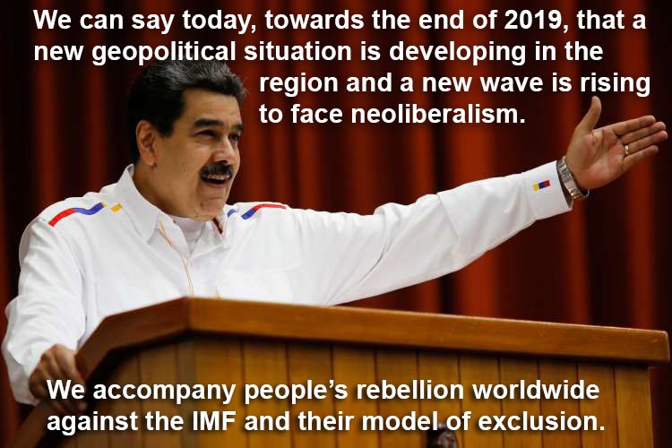 President Maduro speech at Anti-Imperialist Encounter people are rising up against any social exclusionary model from the International Monetary Fund’s (IMF) neoliberal capitalism, adding that “we accompany people’s rebellion worldwide against the IMF and their model of exclusion…we can say today, towards the end of 2019, that a new geopolitical situation is developing in the region and a new wave is rising to face neoliberalism.”