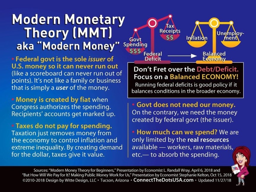 Modern Monetary Theory (MMT) has become popularized by some of the liberal-left because it offers an explanation how to achieve full employment, national health insurance, free college education, and the Green New Deal without raising taxes. Political leaders like Alexandria Ocasio-Cortez and Bernie Sanders have espoused MMT. Economist Stephanie Kelton, a leading spokesperson of the theory, served as chief economic adviser to Sanders during his 2016 presidential campaign.