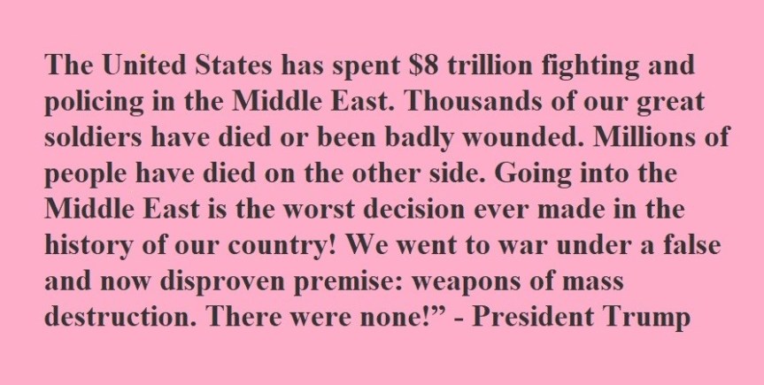 “The United States has spent EIGHT TRILLION DOLLARS fighting and policing in the Middle East. Thousands of our Great Soldiers have died or been badly wounded. Millions of people have died on the other side. GOING INTO THE MIDDLE EAST IS THE WORST DECISION EVER MADE IN THE HISTORY OF OUR COUNTRY! We went to war under a false & now disproven premise, WEAPONS OF MASS DESTRUCTION. There were NONE!”