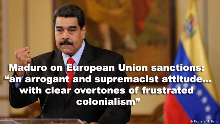 TeleSur: President Maduro Rejects EU Sanctions Renewal Against Venezuela “The EU stuck to Donald Trump’s tail and automatically continues with its cruel, ruthless and failed policy against Venezuela. It is a cruel and failed policy, with clear overtones of frustrated colonialism. … it is a shameful, outrageous and sad role that the European Union plays against the noble people of Venezuela.” President Maduro has highlighted that EU officials maintain “an arrogant and supremacist attitude” towards Venezuela, following the instructions of the U.S. government.