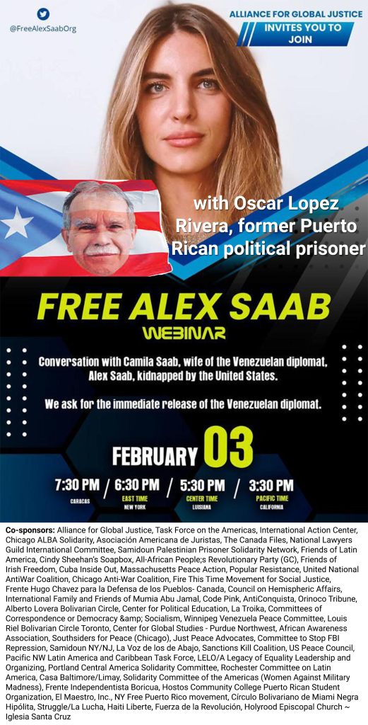 One thought on “Webinar February 3 with Camila Saab, wife of Venezuela diplomat and US political prisoner Alex Saab & Puerto Rican former political prisoner Oscar Lopez Rivera”