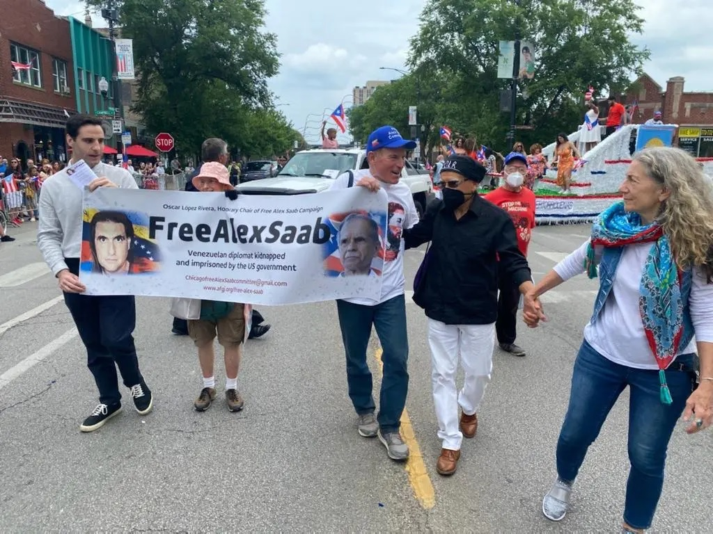 Los defensores del diplomático venezolano encarcelado participaron en el Desfile del Pueblo Puertorriqueño de Chicago el sábado 11 de junio. El contingente de Free Alex Saab de 30 personas incluyó a Oscar López Rivera, Presidente Honorario de la Campaña Free Alex Saab.