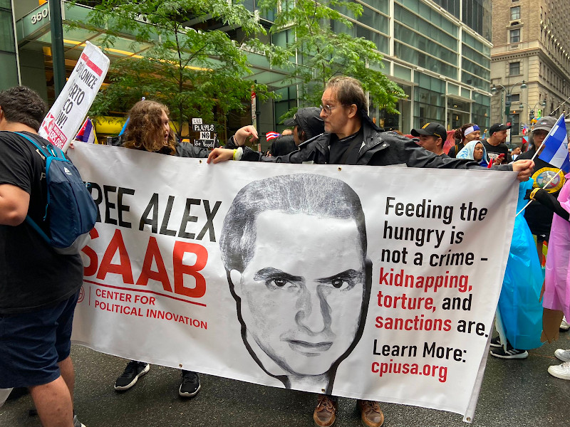 Our Free Alex Saab contingent was near the front of the parade. We carried our Free Alex Saab banner, which read “Free Alex Saab, Venezuelan diplomat kidnapped and imprisoned by the US Government.”