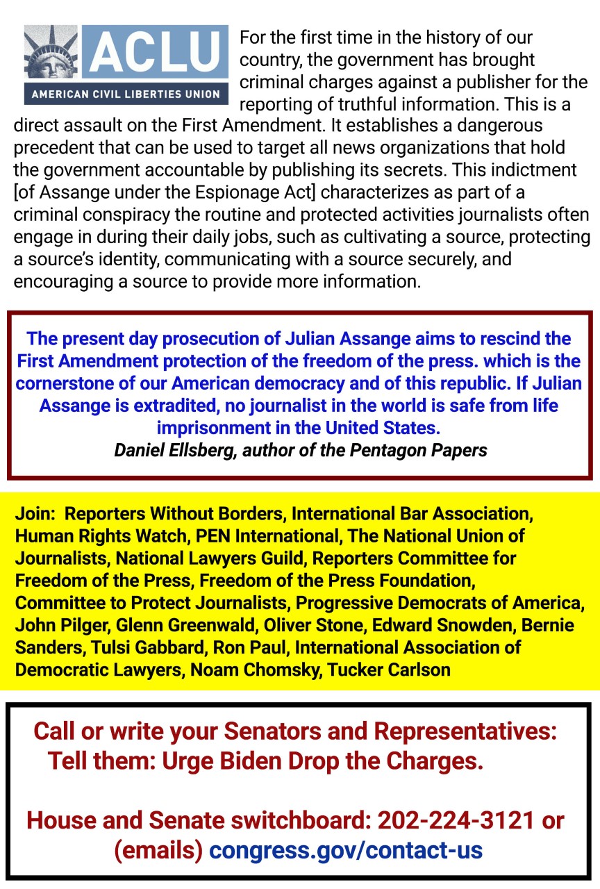 “The precedent set by this political prosecution is extremely dangerous. The extraterritorial application by the United States of its laws to Australian citizen Julian Assange and the death penalty sentence equivalent, 175-year incarceration. Julian will pay the ultimate price for exposing the truth and his persecution inevitably chills and intimidates exposure of government criminality and public contribution to policy formation. Erecting a wall of secrecy between government and the people. Results of which, are before our eyes; corruption, war crimes and crimes against humanity … us!”