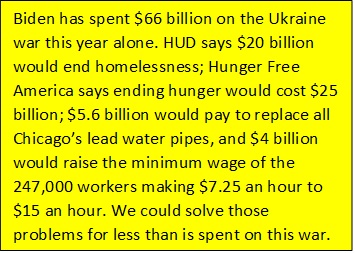 This year the US government has allocated $66 billion to continue this war, now a stalemate, like the Western Front in World War One. The New York Times on September 30 noted, “Congress has now committed more military aid to Ukraine than it has to any country in a single year since the Vietnam War, reflecting a remarkable bipartisan consensus in favor of pouring huge amounts of American resources into the fight.”