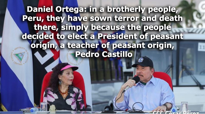 Daniel Ortega: In a Brotherly People, Peru, they have sown terror and death there, simply because the People decided to elect a President of peasant origin, a teacher of peasant origin That’s just class hatred, they can’t bear to see a peasant, a worker, a humble teacher occupying the Presidency, for them that’s unacceptable and they started making war, war and more war against him, until they carried out a coup d’état, and President Pedro, yes, Pedro is his name, President Pedro Castillo, a teacher from the countryside, a rural teacher, you may have seen the photo of him, he’s a simple, humble person, they have him in jail, they have him imprisoned!