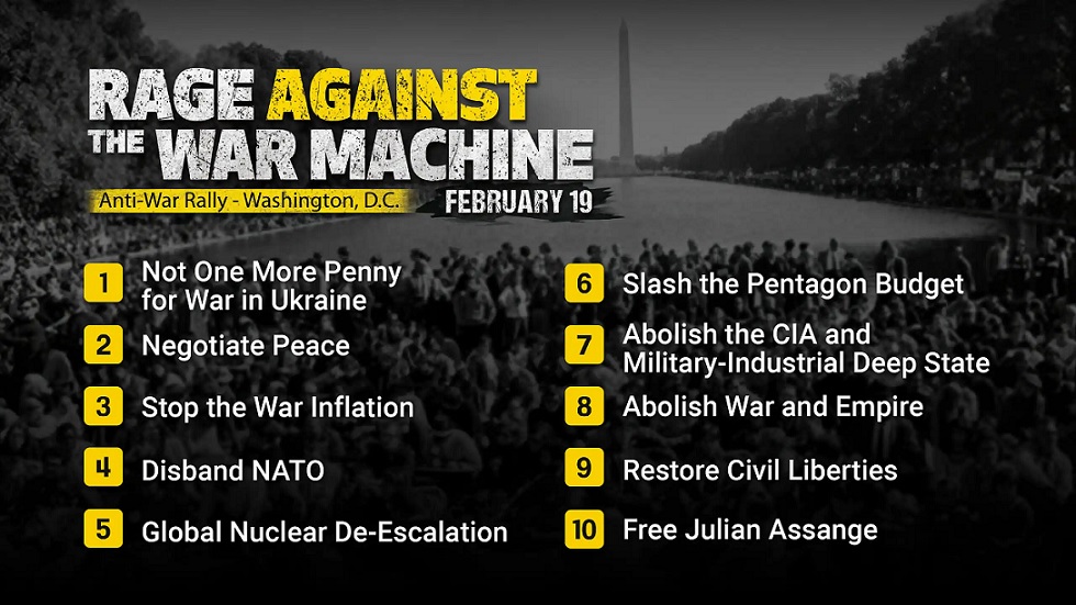 The demands of the Rage Against the War Machine rally were: Not One More Penny for War in Ukraine; Negotiate Peace; Stop the War Inflation; Disband NATO; Global Nuclear De-Escalation; Slash the Pentagon Budget; Abolish the CIA and Military Industrial Deep State; Abolish War and Empire; Restore Civil Liberties; and Free Julian Assange.