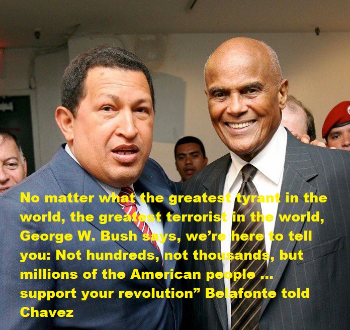 NBC News (2006): Belafonte: Bush ‘greatest terrorist in the world’ Harry Belafonte in Venezuela. “No matter what the greatest tyrant in the world, the greatest terrorist in the world, George W. Bush says, we’re here to tell you: Not hundreds, not thousands, but millions of the American people … support your revolution,” Belafonte told Chavez during the broadcast. He accused US news media of falsely painting Chavez as a “dictator,” when in fact, he said, there is democracy and citizens are “optimistic about their future.” Dolores Huerta, a pioneer of the United Farm Workers labor union also in the delegation, called the visit a “very deep experience.”