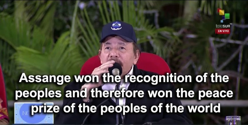 President Daniel Ortega: Assange won the Peace Prize of the Peoples of the World “Assange has already won, from the very moment he made those courageous denunciations knowing that the intelligence and security organizations of the United States, combined with the Europeans, could assassinate him, Assange won the recognition of the peoples and therefore won the peace prize of the peoples of the world. Not the Nobel Prize that is given to those who then destroy, invade, murder, bomb. Assange is recognized and we recognize him as having won the peace prize for his courage, for his dignity, for his firmness and we stand in solidarity in this day with this man who has acted with enormous conscience and with great courage and now, well, he is on the brink of going to the gallows there in the United States of America.”