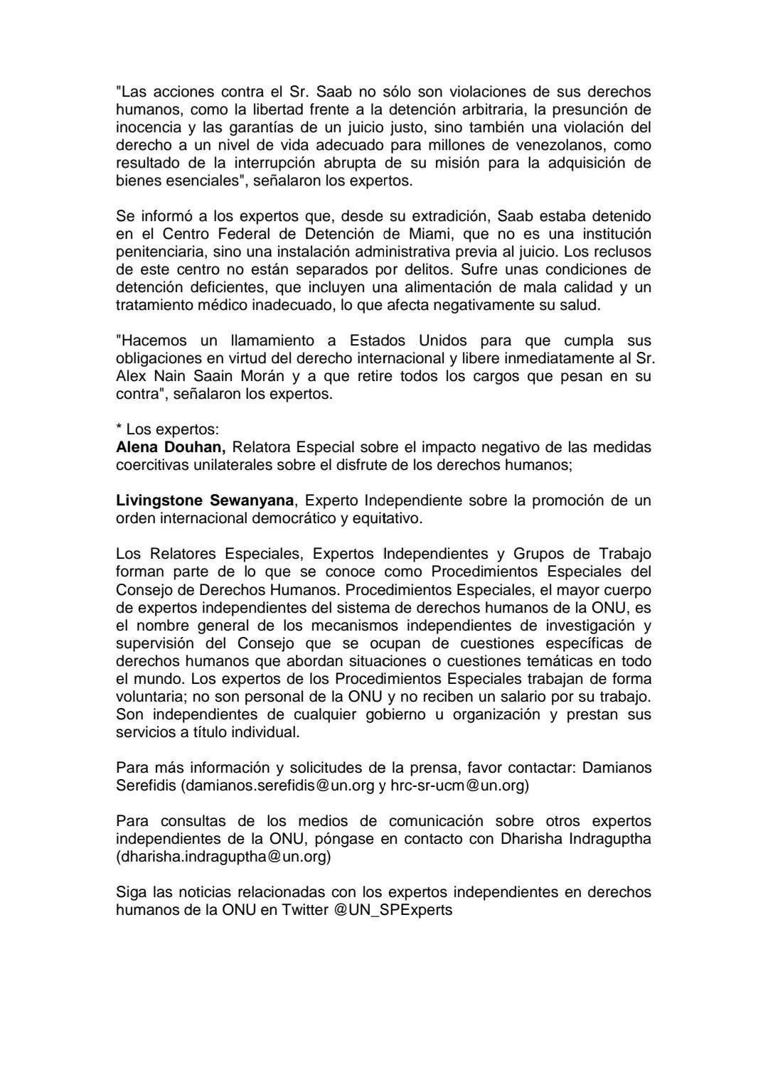 “The actions against Mr. Saab are not only violations of his human rights, such as freedom from arbitrary detention, the presumption of innocence and the guarantees of a fair trial, but also a violation of the right to an adequate standard of living for millions of Venezuelans, as a result of the abrupt interruption of their mission to acquire essential goods,” the experts noted.