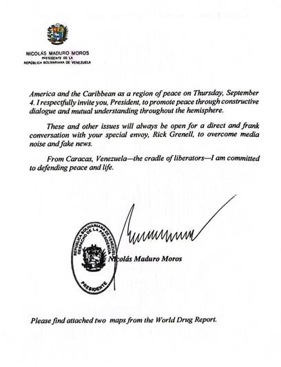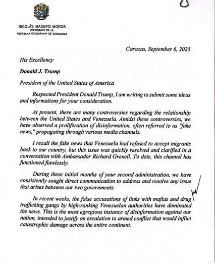 Venezuela President Maduro letter to President Trump, September 6, 2025 Share this: Click to share on X (Opens in new window) X Click to share on Facebook (Opens in new window) Facebook Like Loading... Related