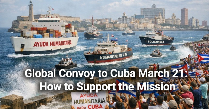 NuestraAmericaConvoy.org: Update – Our Flotilla is Growing into a Global Convoy Last week, we announced an emergency response to Cuba’s humanitarian crisis in the form of a sea mission to deliver aid to the island. The response was overwhelming. From trade unionists to doctors, from community organisers to parliamentarians, messages poured in from across the world asking how they could take part and show their solidarity with the Cuban people. So we are expanding the mission: we announce that Nuestra América is growing from a single sea mission into a global convoy to Cuba — mobilising humanitarian aid by land, air, and sea, and converging in Havana on 21 March.